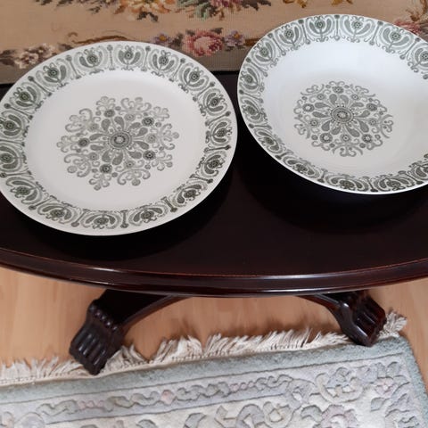 Lautasia on jonkinverran käytetty,veitsen käytöstä tulleita naarmuja jonkin verran,muuten Ok kunto.