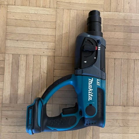Makitan akkulinjaston järeimmästä päästä poravasara piikkaustoiminnon kera. Laatikko ja muut kuvan varusteet kuuluu kauppaan, mutta käsikahvaa ei löydy.