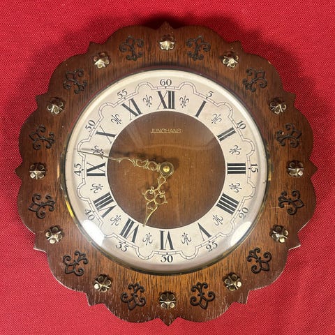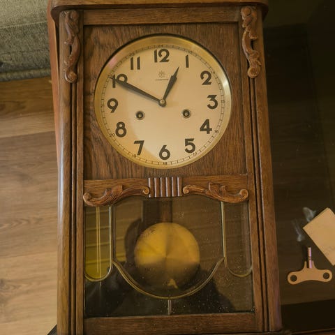 Myydään Junghans-merkkinen antiikkinen seinäkello, lyö puolen tunnin välein. Vedot erikseen käyntiin ja lyöntiin.