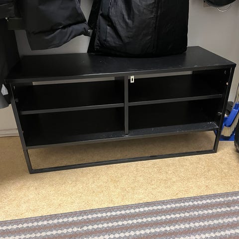 Annetaan tv-taso. Toimii hyvin vaikka päällitaso on antanut hieman periksi.