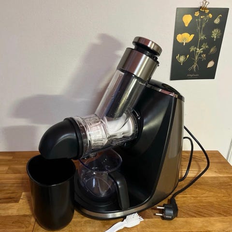 Sandstrøm mehukone. Laite on suunniteltu hitaaseen puristukseen, joka säilyttää mehun ravinteet ja maut.