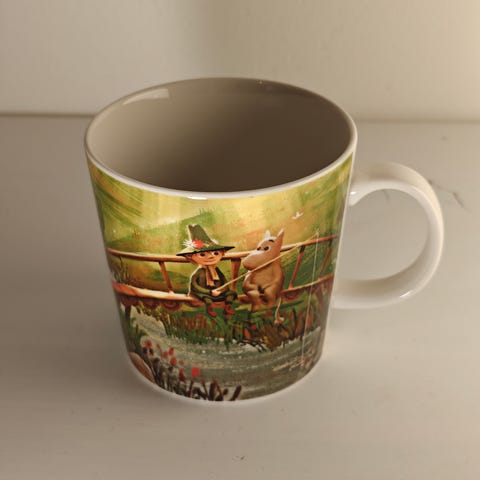 Arabia muumimuki, moomin valley. Vitriinissä säilytetty, lappu paikoillaan.