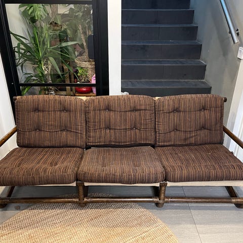 Safari-tyylinen bambu- ja rottinki sohva kangasistuimilla. Tanskalainen 1970 luvun sohvaryhmä. Ollut käytössä yli 50 vuotta, eli käytönjälkiä löytyy. Sohvasta ollaan kuitenkin pidetty hyvää huolta varsinkin sen alkuaikoina sitä on kunnostettu enemmän. Tyynyt on uusittu 12 vuotta sitten ja sohva sekä tuolit ovat täysin käyttökelpoisia. Sohva on hyvin kevyt ja helppo kantaa.