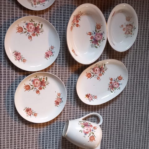 Siistit ja täysin ehjät astiat. Kermakko, sokeriastia ja lautanen, halkaisija 26cm.