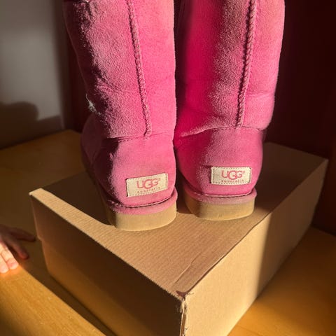 Nahkaiset UGGit, koko 38, ehkä 37 jalkaan sopivat, hieman pieni koko mielestäni. Patinoituneiksi noita voi kai sanoa. Paksu karvavuori, lankkia pintaan ja uusia jalkoja lämmitämään siitä. Tummanruskeat.