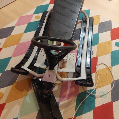 Stigan GT rattikelkka, harvinaisempi malli, musta jossa selkätuellinen penkki. Hieno kunto, penkissä lievä halkeama, hyväkuntoiset jalakset, jarru toimii ja etusuksen sivutuki/jousi kunnossa. Edessä GT suojus ja jousitettu etuhaarukka. Vetoköyden kelaus ja GT ratti. Tyylikäs ja hieno kelkka. Tarpeettomana, nopealle, 40 €. Espoo Matinkylä.