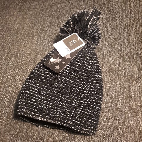 Harmaa kaunis ja siistikuntoinen pipo. Timantteja etupuolella. Kaksinkertainen neulos, joten lämmin.