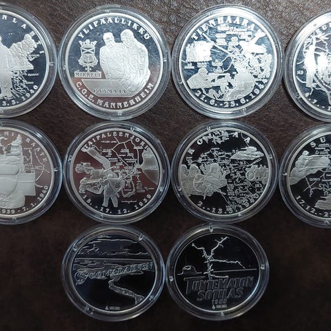 Mitalien lisäksi sisältyy laatikko ja hieno kansio, jossa jokaisesta 13:sta mitalista kerrottu erikseen mihin tapahtumiin ne liittyvät ja miksi nämä tapahtumat olivat sodan kannalta merkittäviä.