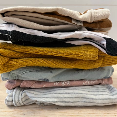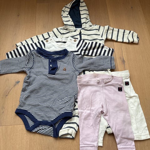 5 kpl bodya, 3 kpl housuja, 1 vadtasyntyneen pipo ja 1 kpl sukkia. Merkkeinä mm. Lindex ja H&M, sukat Polarn o. Pyret.