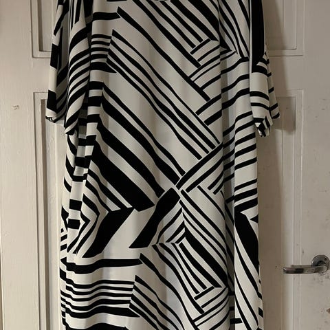 Mekko on edestä ja takaa mustaa silkkiä. Sivut ja hihat mustaa samettia. Malli on vuodelta 1985 ja on marimekon vintagea. Sopii hyvin promootion juhlatilaisuuksiin.