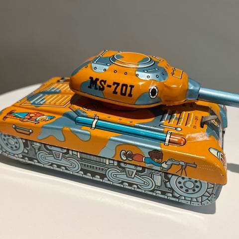 Peltilelu panssarivaunu pyörivä torni. Liikkuu jousitoimisesti. Pituus noin 23.5cm.Hyvässä kunnossa, mutta avain puuttuu.