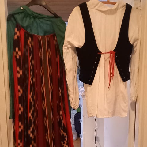 Erittäin siisti kokonaisuus: hame, paita, esiliina, liivi, tasku, hiusnauha ja helysolki. Hameen pituus 70 cm ja vyötärö 61 cm. Ollut 155 cm pituisella tytöllä.