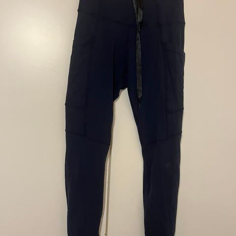 Naisten mustat filan leggingsit, joissa nilkoissa lenkit jalanpohjiin laitettavaksi ja vyötäröllä itselisätyt narut. Koko s. Haara-lahje n 70cm+lenkki n 12cm, vyötärön leveys n 33cm.
