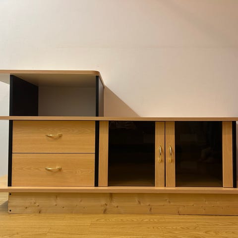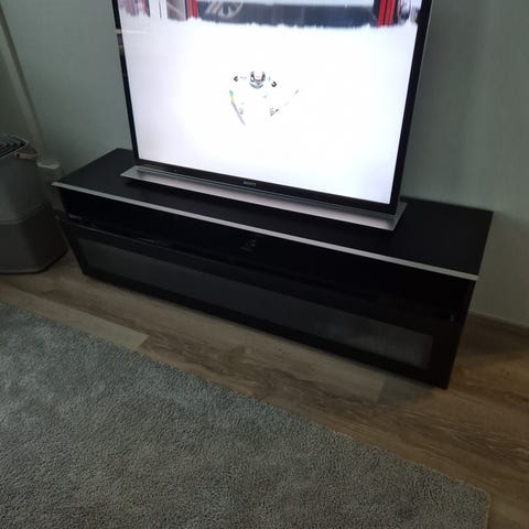 Hyvässä kunnossa oleva tv taso, näyttää huteralta mutta kestää hyvin 65” tv painon. Mittanauhaa ei ole että pääsisin mittailemaan. Pituus arvio telkkarista
