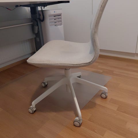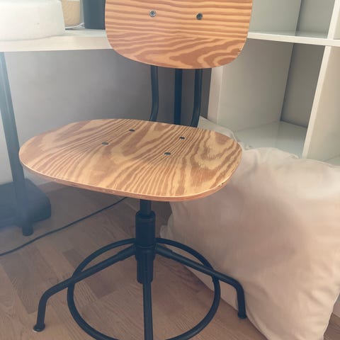Ikea Kullaberg pyörivä tuoli. Vähällä käytöllä ollut, ehjä ja siisti. Pientä kulumaa selkänojan sivuilla. Korkeus säädettävissä pumpulla. Istuinkorkeus tuolin etureunasta mitattuna korkeimmillaan noin 56,5cm ja matalimmillaan noin 46cm.