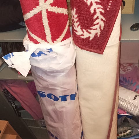 Tosi kauniit ja jämäkät pienet matot. Mattojen väri tumman punainen tai tumma viininpunainen. Materiaalissa on 40 pros polyesteriä, sen verran sai vielä lapusta selvää. Pohja lienee juuttia tai sen tapaista materiaalia. Nukka ei mene lyttyyn ja helppo pitää imuroimalla kunnossa. Hinta on mattojen yhteishinta.