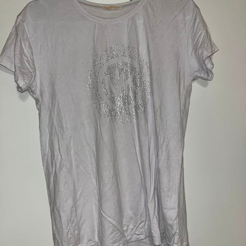 Valkoinen t-paita, jossa edessä timantteja ja teksti sekä hihoissa reikä yksityiskohdat. Koko S. Kaikai n 40cm, pituus n 50cm.