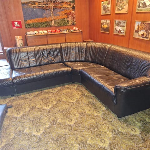 Yhdessä istuintyynyssä ja käsinojassa pieni reikä. Joitain ja ruoka/juomatahroja kankaassa ja kahden istuimen kohdalta jouset ovat laskeutuneet (mutta silti istuttava).