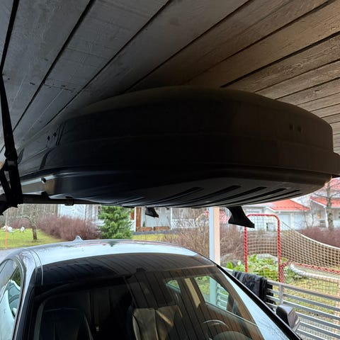 Elämää nähnyt kattokaiteisiin kiinnittettävä suksiboksi ja asialliset kattokaiteet. Virkansa hoitaa mutta boksia ei saa lukkoon, avaimet kadonneet. Nyt edulllisesti kaiteiden hinnalla.