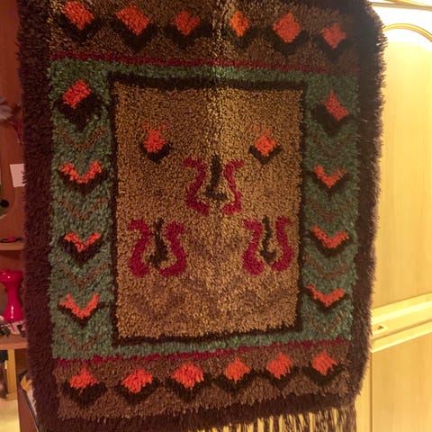Vaatisi pesua, mielestäni muutoin hyvässä kunnossa. Ollut kaapissa pölyttymässä ja ryppyyntymässä: voi laittaa seinälle tai pitää mattona!