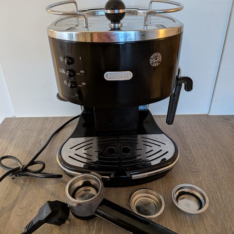 De'Longhi espresso-kahvinkeitin, jossa on ruostumattomasta teräksestä valmistettu runko ja mukana suodatinpidikkeet. Laite soveltuu espresso-tyyppisen kahvin valmistukseen kotikäyttöön.