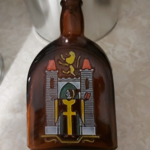 Sininen lasipullo, suorakulmainen muoto, sininen lasimateriaali.