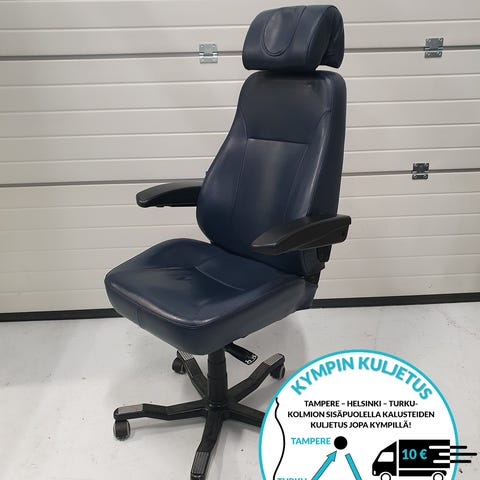 Tukeva KAB valvomotuoli tummansinisellä nahkaverhoilulla. Asiallisessa kunnossa, vaikka käytön jälkiä toki jo jonkin verran löytyykin, kts. kuvat. Tässä on jämerä tuoli kovaan käyttöön!