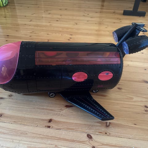 Mitat kuvissa. Tuli meille käytettynä eikä Googlen AI osaa kertoa, mistä on kyse. 🤭 Siivet voi irrottaa ja/ tai avata ja aluksen toinen pää kääntyy ylöspäin paljastaen aluksen sisukset. Lienee ehjä ja on siisti. Etunoljakassa; tarvittaessa kulkeutuu omien menojen mukaan myös muuallepäin Joensuun kantakaupungin alueella. Koiratalous, mmm.
