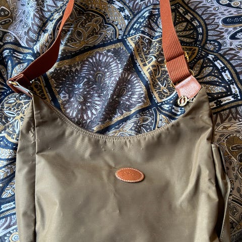 Longchamp-olkalaukku naisille, valmistettu kestävästä kankaasta. Laukussa on säädettävä olkahihna ja ulkotasku, kaksi sisätaskua, joista toisessa on vetoketju, väri ruskea. Sopii arkipäivän käyttöön ja kevyisiin kuljetustarpeisiin.