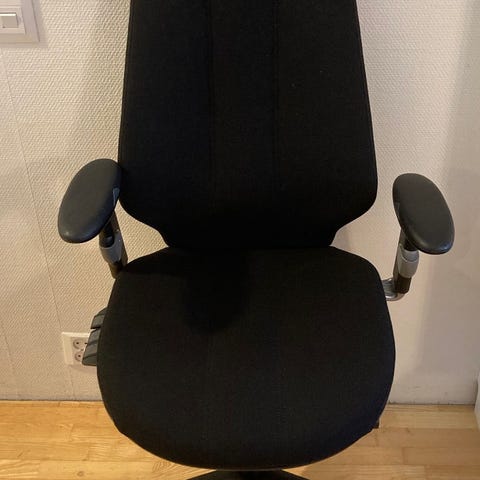 Uudelleenverhoiltu vaaleanharmaalla Kvadrat Remix kankaalla. Säädöt, istuimen syvyys ja korkeus 44/58 cm, keinumekanismi lukituksella. Selän kallistuksen ja ristiseläntuen säätö. Käsinojien leveys, korkeus ja kannen säätö. Musta ristikko pyörillä, vähäisiä käytönjälkiä jalkaristikossa.