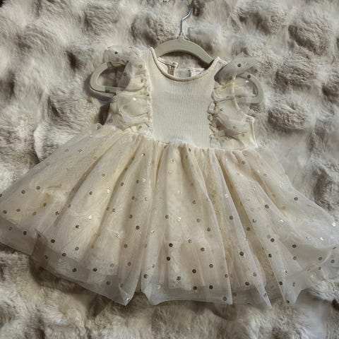 Myynnissä kaksi otsikon mukaista tyllimekkoa. Kerran käytetty valokuvauksessa.