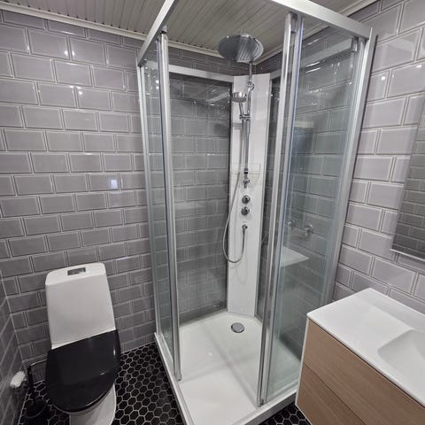 Myydään lähes uusi suihkun lasiseinä. Oli käytössä noin 2 viikkoa ennen purkamista. Seinä karkaistua lasia ja mukaan tulee kiinnikkeet lattiaan ja seinään.