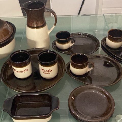 Myydään isot ruokalautaset 5kpl. Kermasaven valmistamia. Halkaisija 26cm. Lautaset hieman ovat naarmuuntuneet, mutta muuten ihan hyvä kunto.