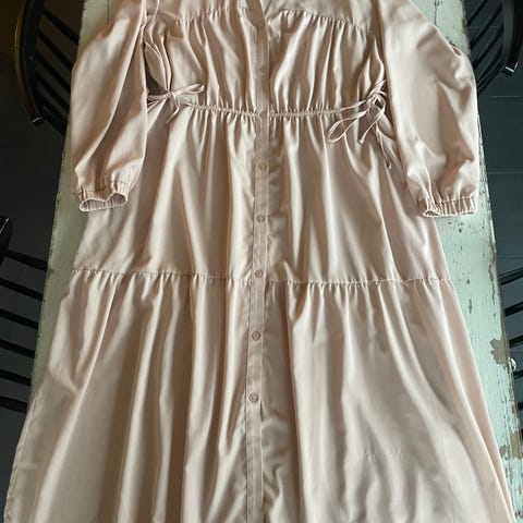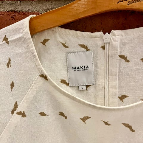 Makia Kesämekko on valmistettu puuvillasta ja on väritykseltään kirjava. Mekko on naisten kokoluokkaa L. Löytyy neljä taskua, 2 edestä ja 2 sivusta. Käytetty 2 kertaa. Huom, katsp kankaan kunto kuvista, ei ole siis huonokuntoinen, mutta kangas näyttää käytetyltä.
