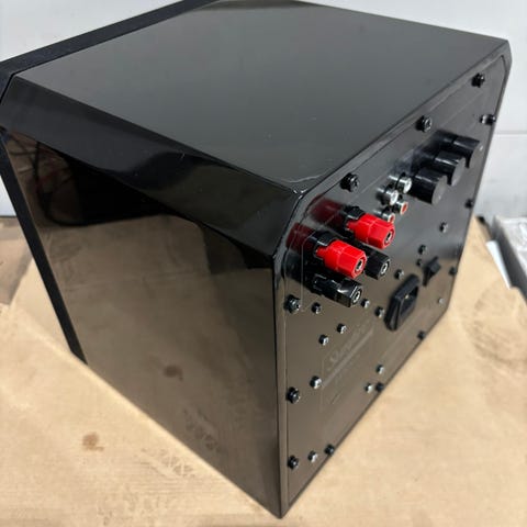 The Super Eight, which was designed specifically to work with the Mod1, is a ported, bass-reflex design with a front-firing 8" cone in a nearly cubical cabinet measuring 12"H x 11.5"W x 11.75"D. The port is a "precision-tuned snorkel type," and the amplifier is a "high-power BASH digital hybrid with digital-switching power supply, enhanced for peak power output." The amp outputs 200W, or 450W peak. The 8" driver is a super-long-throw design with a 30-ounce ferrite magnet. The frequency response is a claimed 28-180Hz, and the crossover is adjustable from 40 to 160Hz. On the rear of the cabinet are: a power switch that can be set to Off, On, or Auto; volume, phase, and crossover controls; an enable/disable crossover switch; and terminals for connection to a receiver or preamp that lacks an RCA subwoofer output
