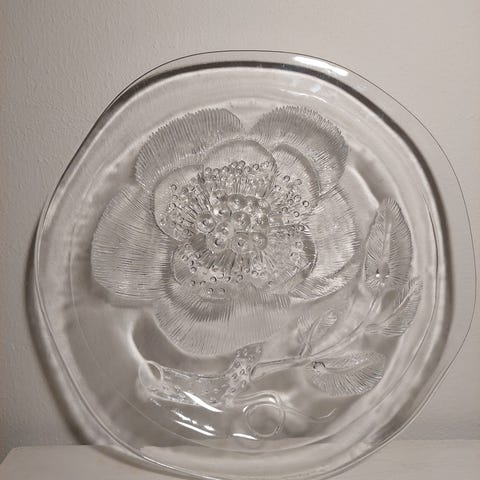 Oiva Toikan Nuutajärvelle suunnittelema Pioni-sarjan lasilautaset. Halkaisija 17cm.