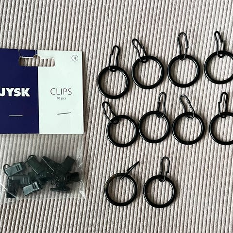 IKEA verhorenkaat, yhteensä 19 kappaletta. Valmistettu valkoisesta muovista. Soveltuvat verhojen ripustamiseen.
