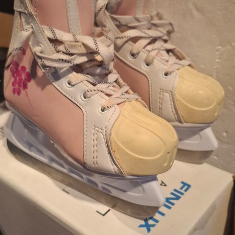 Tyttöjen luistimet, hokkarit, kokoa 35. Pohjallisen mitta kantakuppiin 22,5cm. Siistit käytetyt, hieman kulumaa. Toisen luistimen tarrasiteen vastakappale hieman revennyt, kestää kyllä vielä ja ei estä käyttöä, koska nauhat tulevat jokatapauksessa tarrasiteen ylä- ja alapuolelta. Postitan toridiilillä ja kulkee omien menojen mukana lähikunnat.