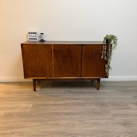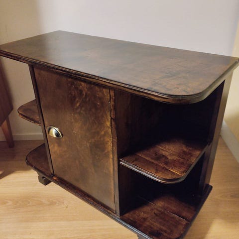 Hyväkuntoinen radiokaappi / radiolipasto / lipasto n 40-luvulta. Lipasto on koivua, siisi ja hyväkuntoinen. Lakkapinta on ehjä ja siisti Lipasto on kokonaan puuta. Kaunis messinkivedin ovessa