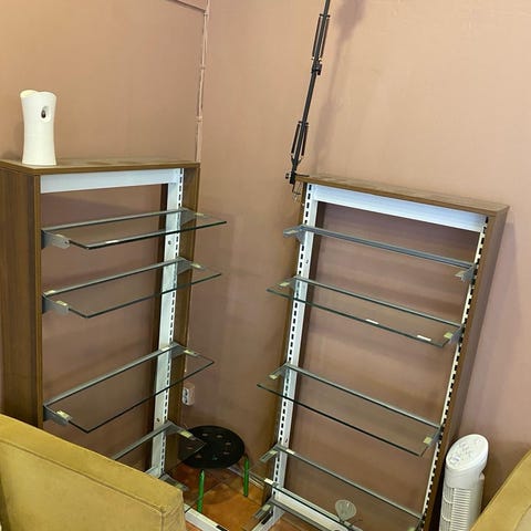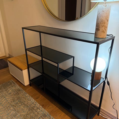 Erinomaisessa kunnossa oleva hyllykkö. Tasot lasia, runko metallia. Irrotettavissa kuljetusta varten. Hyllyllä oleva lamppu ei kuulu kauppaan, mutta myynnissä myös.