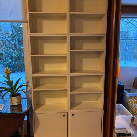 Annetaan ikean musta kirjahylly. Kirjahylly ilman kirjoja. Kirjahylly on ”huollon” tarpeessa. Nouto katajanokka