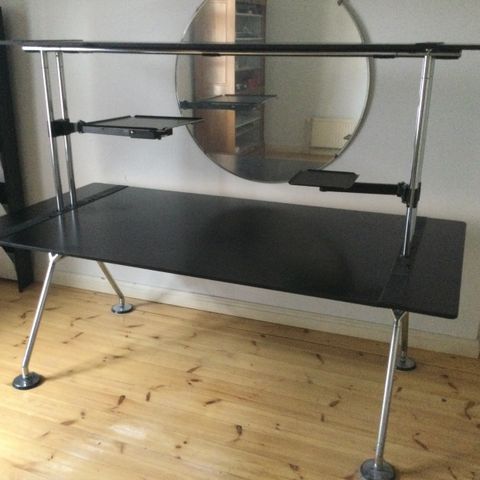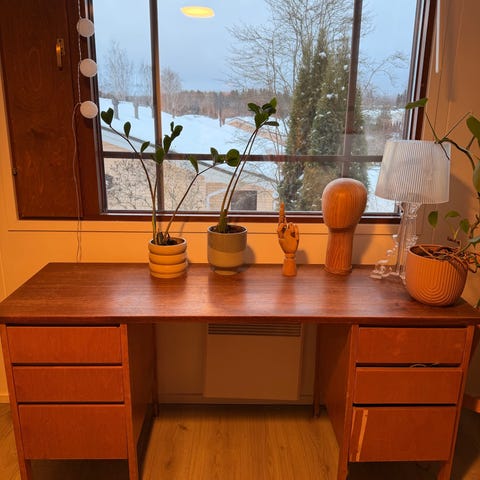 Arne Vodderin suunnittelema työpöytä ja senkki, malli 209, valmistettu Sibast Moblerille Tanskassa 1960-luvulla. Pöydässä on useita vetolaatikoita ja liukuovikaappi, jotka tarjoavat runsaasti säilytystilaa.