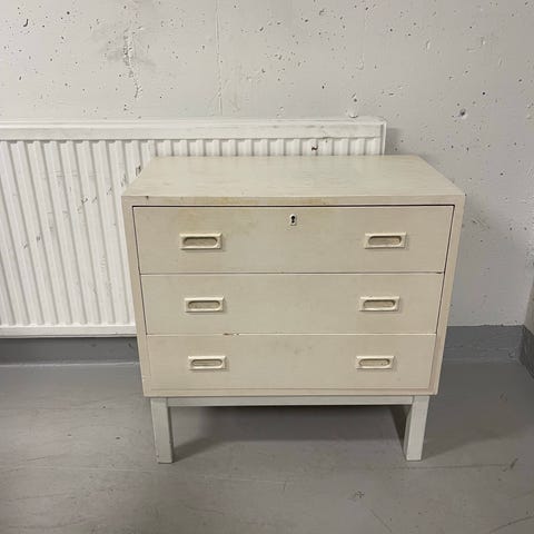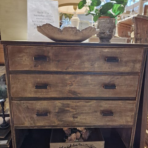 Hakusanat: vintage, lipasto, ruskea, kaareva, laatikot, vintage huonekalut, metallivetimet