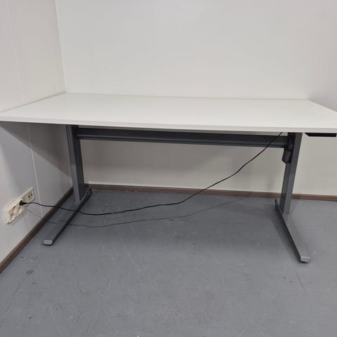 Sähköpöytä, jossa on valkoinen kansi ja harmaat jalat. Pöydässä on sähkötoiminto korkeuden säätämiseen, ja se on varustettu virtajohdolla.