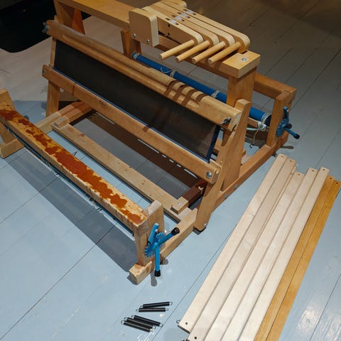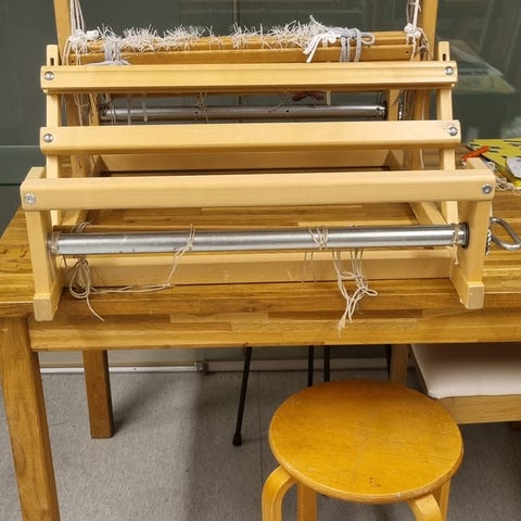 Toika Leena nelivartiset pöytäkangaspuut ja jalusta. Kudontaleveys 60cm. Kunto hyvä, pirrassa hieman ruostetta (kts. kuva).
