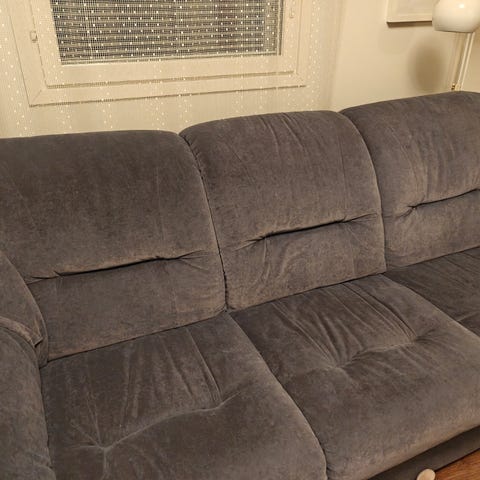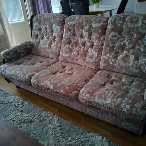 Annetaan kolmen istuttava sohva, kankaat kulunut ja on tosi pehmeä istua. Pystyy levittämään varavuoteeksi, näkyy kuvassa 2. Omat kantajat mukaan.