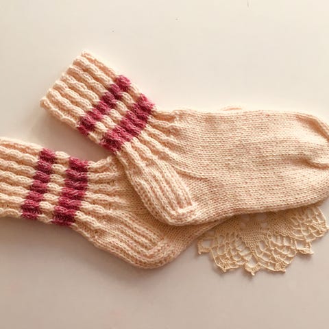 Uudet vaaleanpunaiset käsinkudotut villasukat joissa myös vahvistettu kantapää.