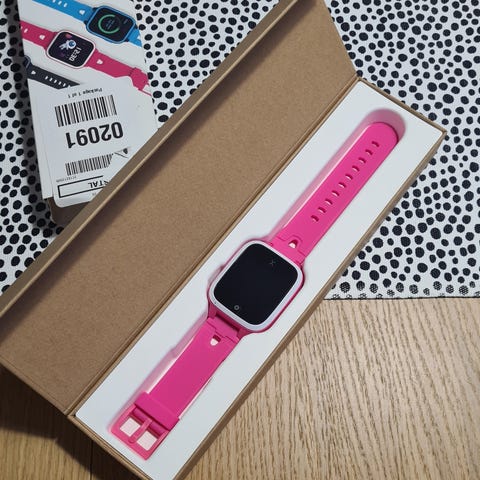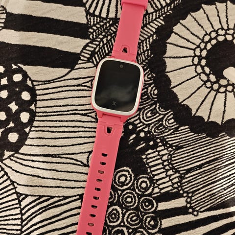 Myynnissä vajaan viikon käytössä ollut kellopuhelin. Mukana musta ja pinkki ranneke. Kellossa ei mukana sim-korttia. Sim-kortin ja liittymän voi ostaa xploran nettisivuilta.