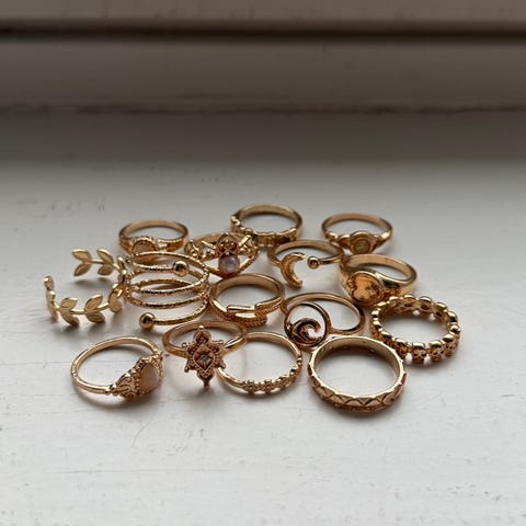 Söpöjä sormuksia, sopii pienille/normaaleille sormille, mutta setissä on eri kokoisia sormuksia eli osa on pienempiä kuin toiset. Kullan värisiä, en tiedä materaalia. Muistaakseni Bershkasta tai H&M:stä, mutta en ole varma. Käyttämättömät!