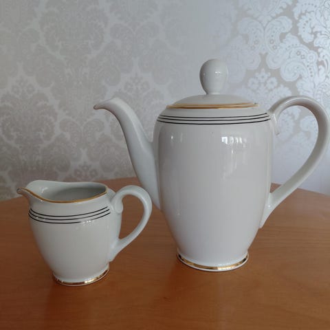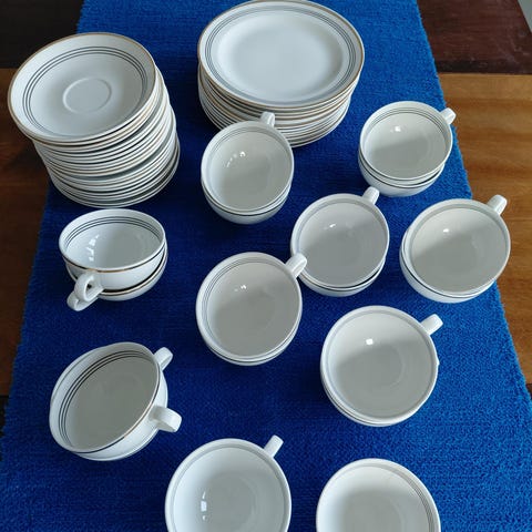 Myydään hyväkuntoinen Arabian Minerva- sarjan teeastiasto. Yhdeksän teekuppia, tassia ja asettia. Kahdessa kupissa hyvin pieni "virhe", kuva 4.